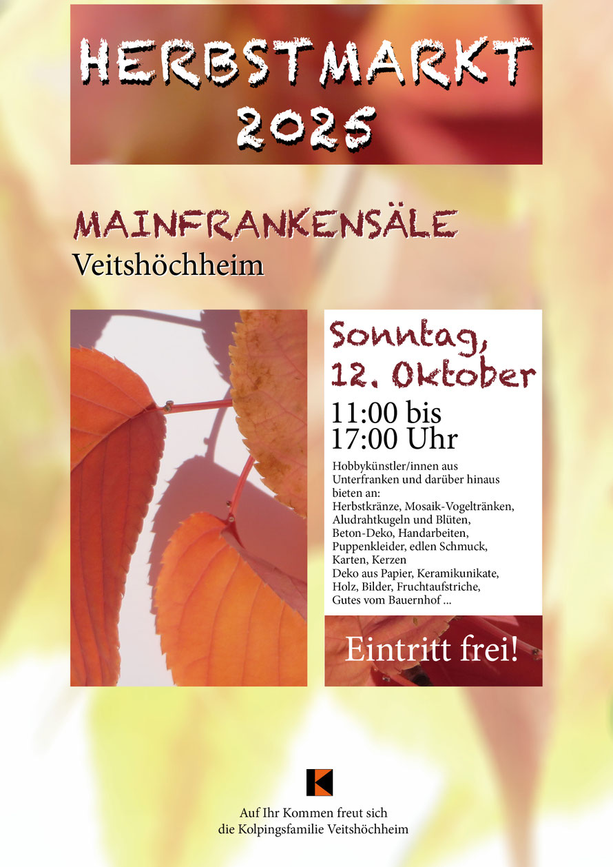 Der Herbstmarkt, den die Kolpingsfamilie Veitshöchheim auch in diesem Jahr wieder in den Mainfrankensälen veranstaltet, findet zwar erst am Sonntag, 11. Oktober 2020, von 11.00 bis 17.00 Uhr, statt. Da aber bereits zu diesem Zeitpunkt 50 % der Tische vermietet sind, bitten wir alle Hobbykünstlerinnen und Hobbykünstler, die beim Herbstmarkt dabei sein wollen, sich möglichst bald bei uns zu melden. Anmeldungen und weitere Infos gibt es bei Gerdi Möller, Telefon 0931/95388 (AB ist geschaltet). Eine Anmeldung per E-Mail über unsere E-Mail-Adresse kolping-vhh@web.de